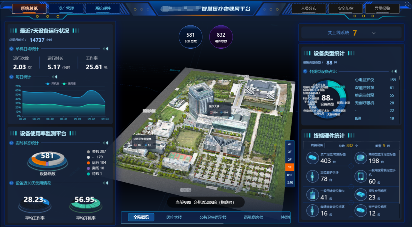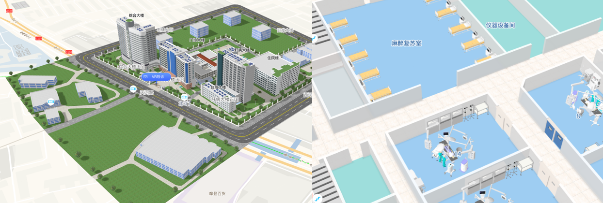 院内外地图一体化展示 / 高质量室外楼栋定制化建模 / 高精还原室内3D墙体 / 设备设施3D模型支持独立楼层展示和多层楼层叠加展示 / 楼宇3D模型支持压缩动画展示高精矢量三维地图地图,可任意旋转、缩放、切换任意视角